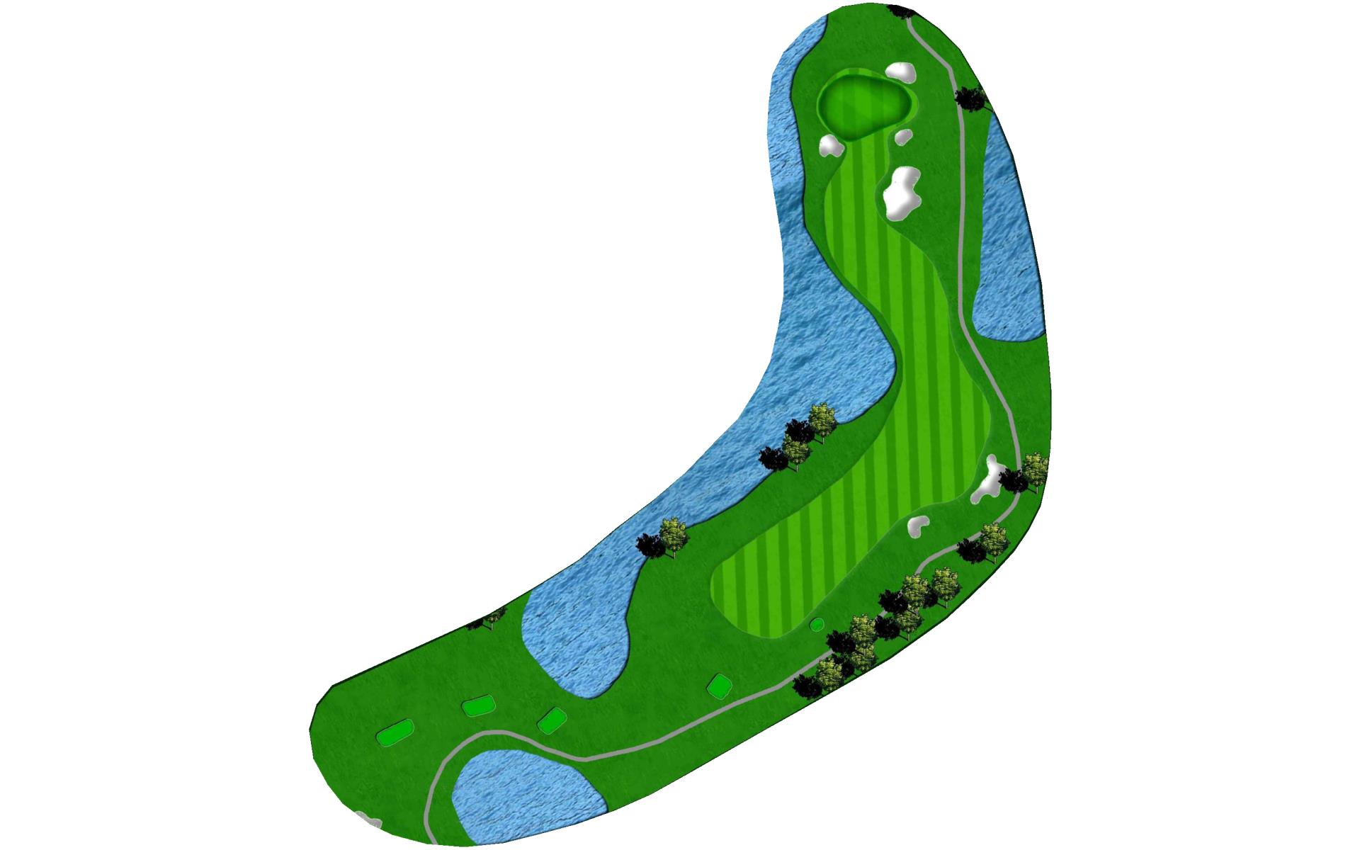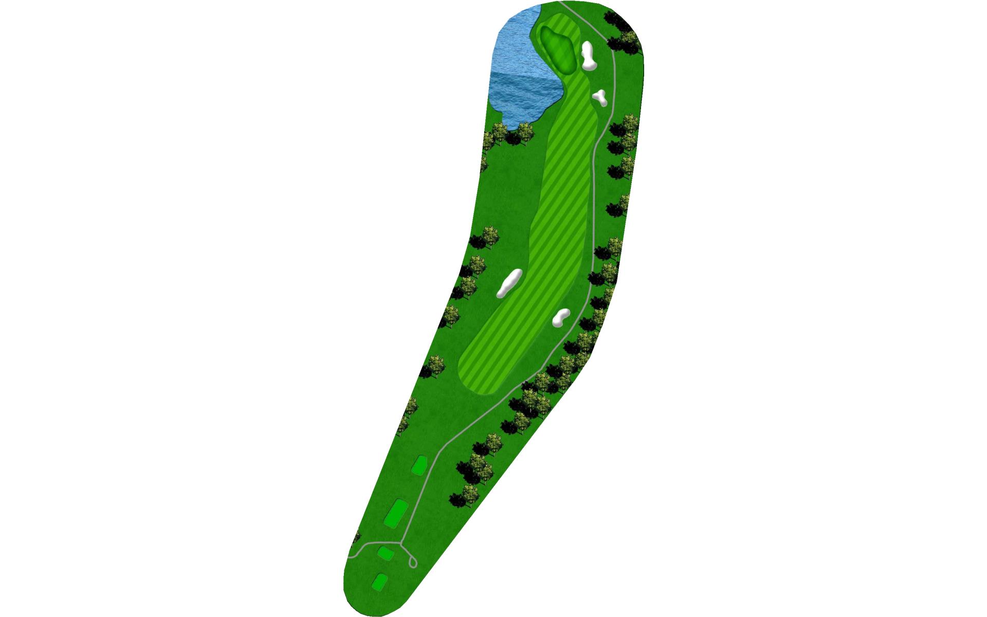 A classic risk-reward dog leg left par 4 where the longer hitters can take their tee shot over the lake leaving a small wedge into a green guarded by bunkers left, right and over the back right behind the putting surface. Should one choose not to take on the lake, a tee shot up the right side of the fairway will leave the player with the most ideal shot into this green. Pampas grass helps show the right edge of the lake. Beware as the fairway slopes to the left toward the lake.