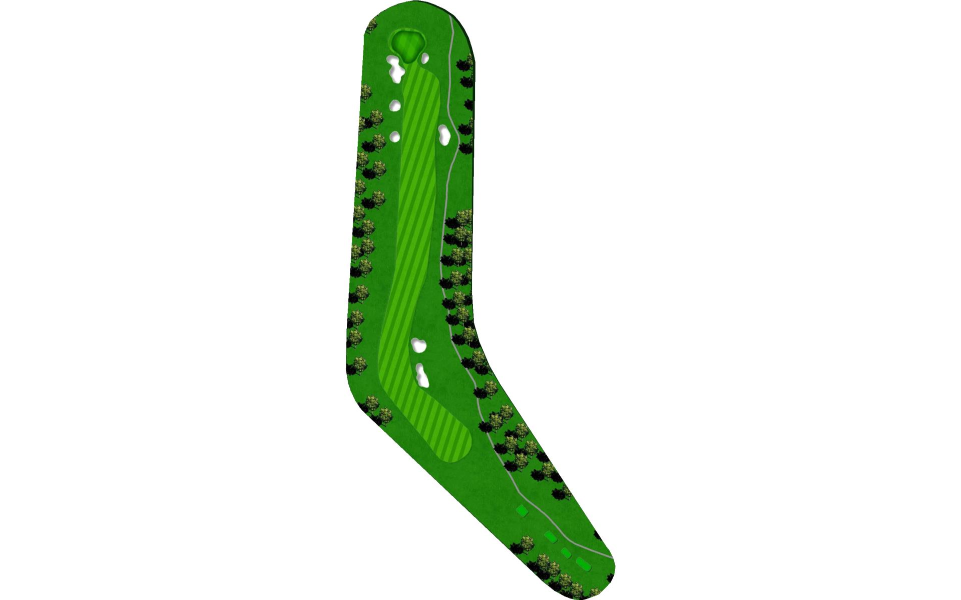 A sharp dogleg right par 4 with a multitude of options off the tee. Most shots with a driver off the tee will run through the fairway and end up OB. If driver is pulled the corner can be cut leaving a short wedge in to a green guarded by bunkers at the front and back of the putting surface. The safe play off the tee might just be a 3 wood to the left of the fairway bunker at the bottom of the hill.