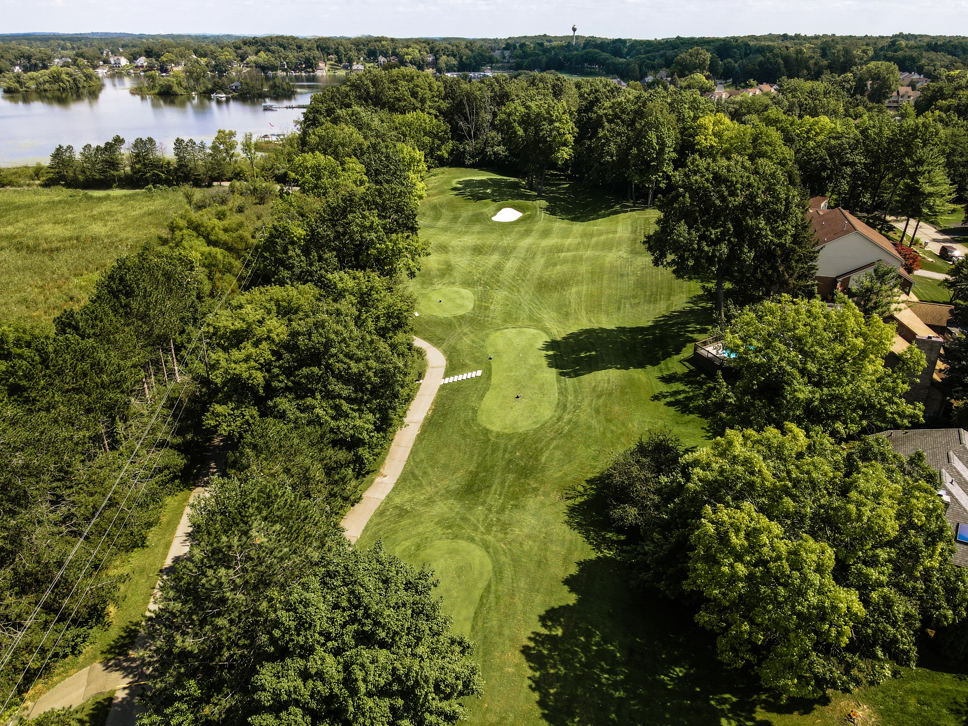 To paraphrase Arthur Hills the “Fun starts here”. Crooked lake guards the entire left side of this hole. The long par 4 requires a lot of attention on the approach. With the large bunker protecting the front right and a sloping green from right to left. It is key to hit the center of the green. This defining finishing hole has determined many outcomes of competitive play.