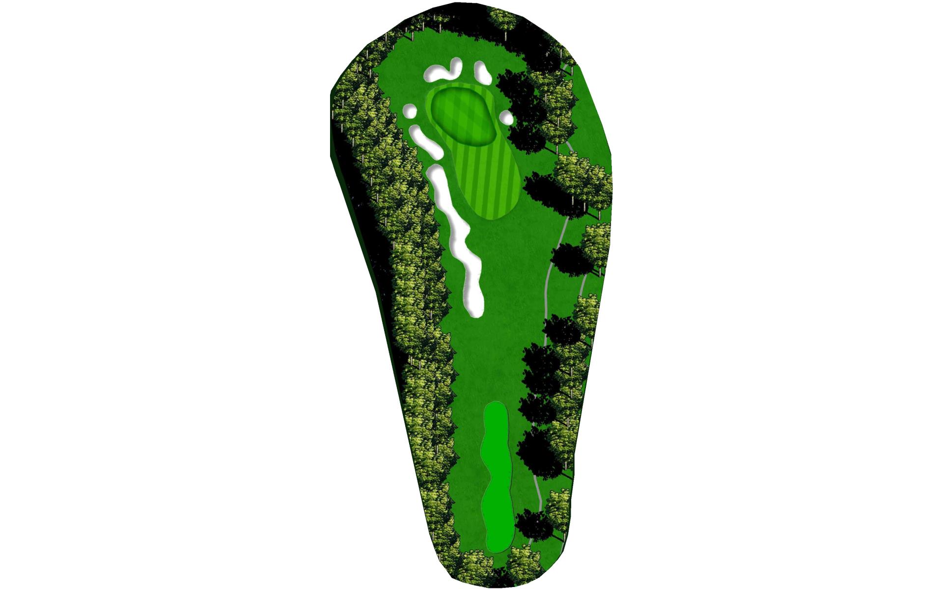 The longest hole on the course, this par 5 requires three well-struck shots. The landing area features a direct incline and, from there, a well-placed second will leave a mid-iron into a green that’s protected by a large pot bunker.